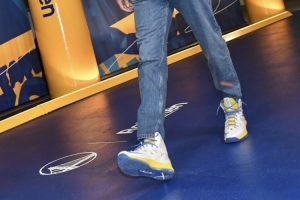 “他应该是从保险柜里拿出来的吧,”詹姆斯笑着说,“我记得他穿过那双,我不知道是不是他的新秀年。他是哪一年进联盟的,10-11年吗?好吧,是09-10年,所以那是詹姆斯10代吧,我记得他以前在比赛中穿过那双,我不确定他是不是有一双额外的,这双可能就是那双,他应该是从保险柜里拿出来的吧。”